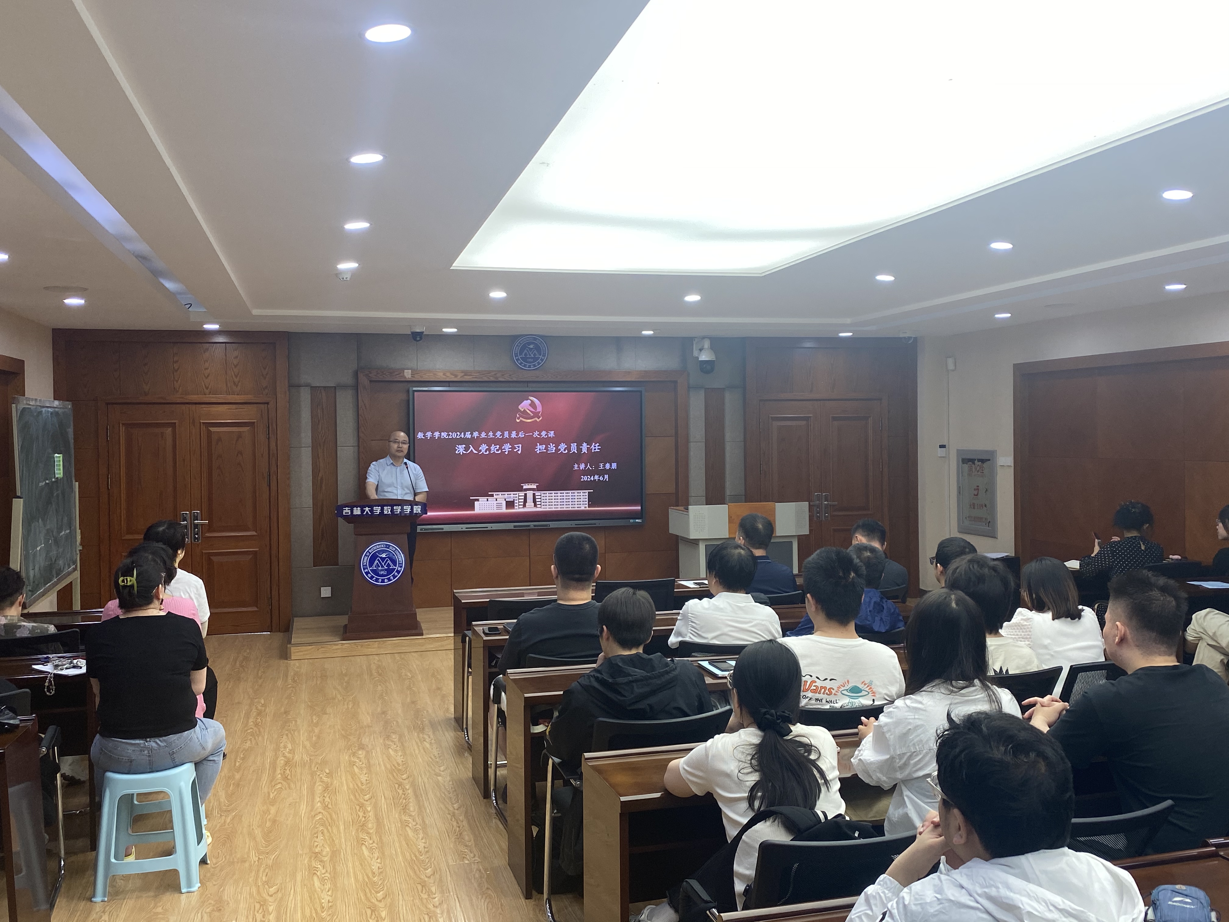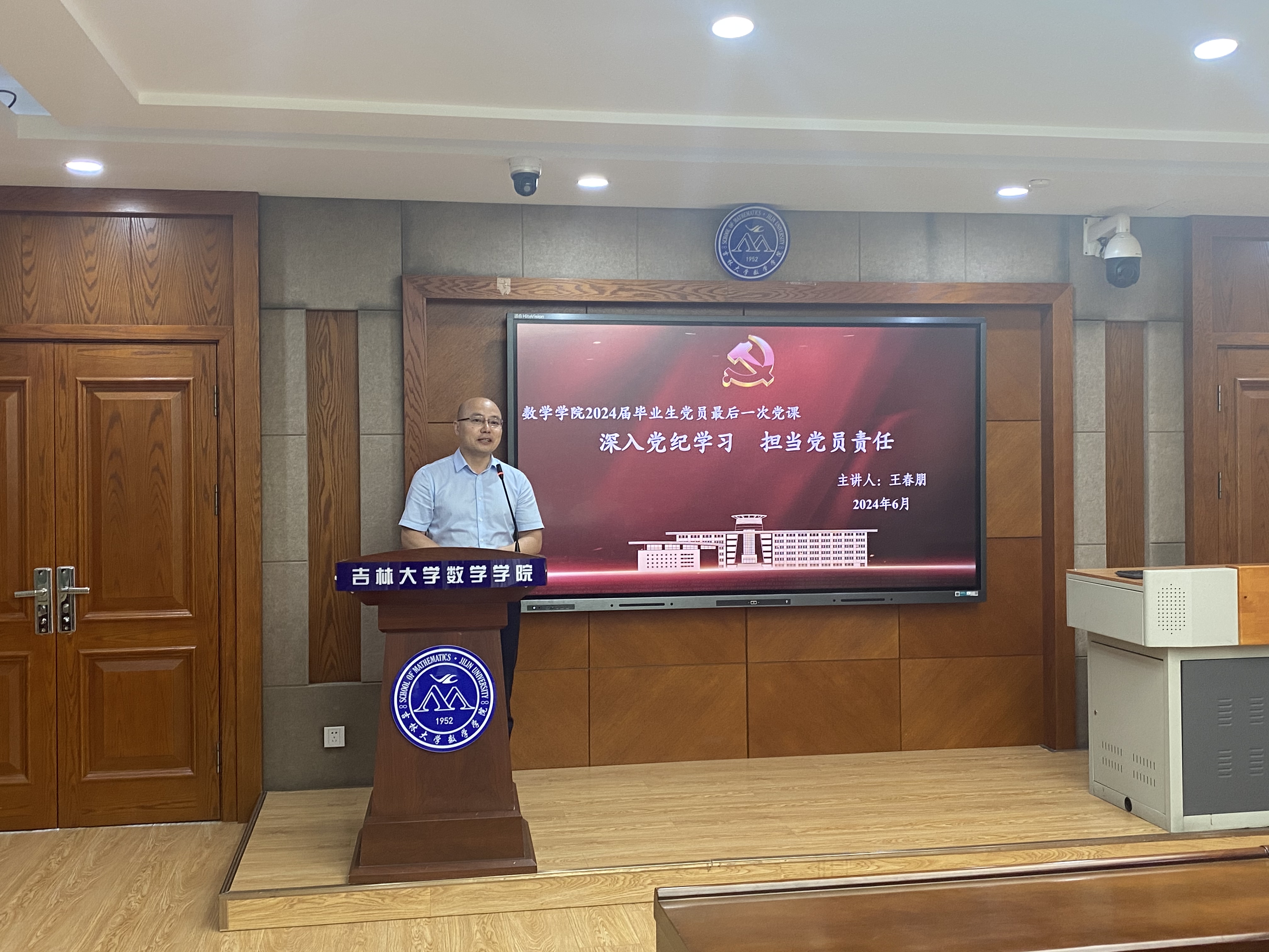 为推动党纪学习教育走深走实,教育引导全体毕业生党员增强纪律意识,在知敬畏、存戒惧、守底线中夯实理念信念之基,在推进强国建设、民族复兴伟业中展现青春作为、彰显青春风采、贡献青春力量。6月17日,A片 党委书记王春朋为2024届全体毕业生党员讲授了毕业前“最后一次党课”。