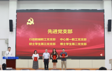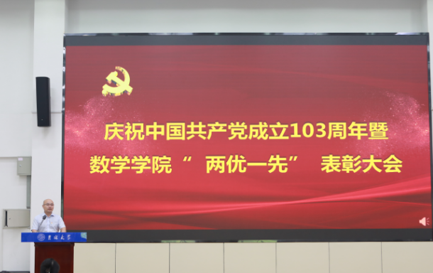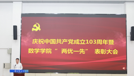 为庆祝中国共产党成立103周年,继承和发扬党的优良传统,激励广大党员牢记党的宗旨、坚定理想信念、强化党员意识、激发学习工作热情,更好地发挥共产党员的先锋模范作用,6月20日,A片 党委在数学楼二楼报告厅召开庆祝中国共产党成立103周年暨“两优一先”表彰大会。党委副书记陈续升主持会议并宣读表彰决定。