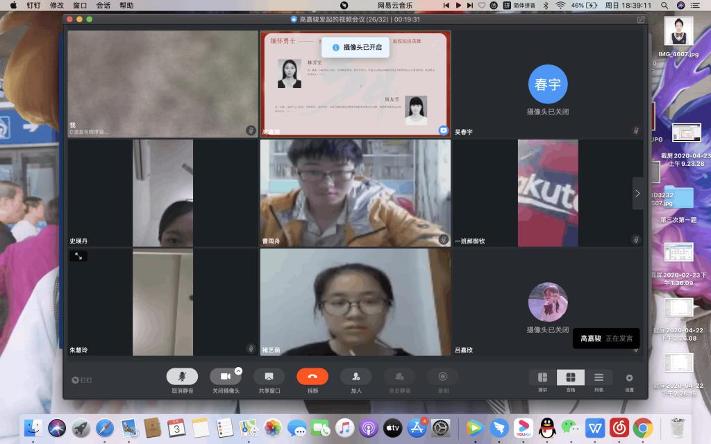 首先,在本次会议中,同学们学习了被追授“中国青年五四奖章”33名在“抗疫”中牺牲的英雄的英勇事迹,从他们身上学到了很多作为当代大学生、新青年应该具有的优秀品质和为人民、为社会、为国家积极贡献自己力量的精神。其次,在本次会议中,来自不同地区的几位同学分享了当地的疫情形式和防护措施。来自湖北的李雄胤同学,谈到了疫情严重和缓和两个时期的不同举措。同时谈到了大家对武汉的偏见,武汉为抗击疫情做出了重大奉献甚至牺牲。黑龙江作为现在疫情最严重的地区之一,来自黑龙江的王嘉同学也分享了目前当地的举措。小区设置岗哨,严格管控检查,力争减少新增;严控境外输入,期盼形式缓和。吉林作为一直以来疫情较轻的地区,来自吉林的宫泽宇也发表了看法:即使疫情不重,吉林省也没有放松,严格管控,尽力使新增为0。最后,在本次会议中,同学们也探讨了疫情期间应该如何学习和生活,学委提到在疫情期间也要好好学习,不能因为“假期”就彻底放纵自己。关于合理运动,班长特别强调,虽然在家防疫,但是也一定要劳逸结合,保持良好的身体素质。虽然疫情逐渐好转,但是也要时刻注意保持警惕,防范风险。同时班长也呼吁同学们在条件允许情况下做一些志愿活动,学习五四精神争做优秀青年,要尽力去帮助他人,也要切实执行上级的命令。