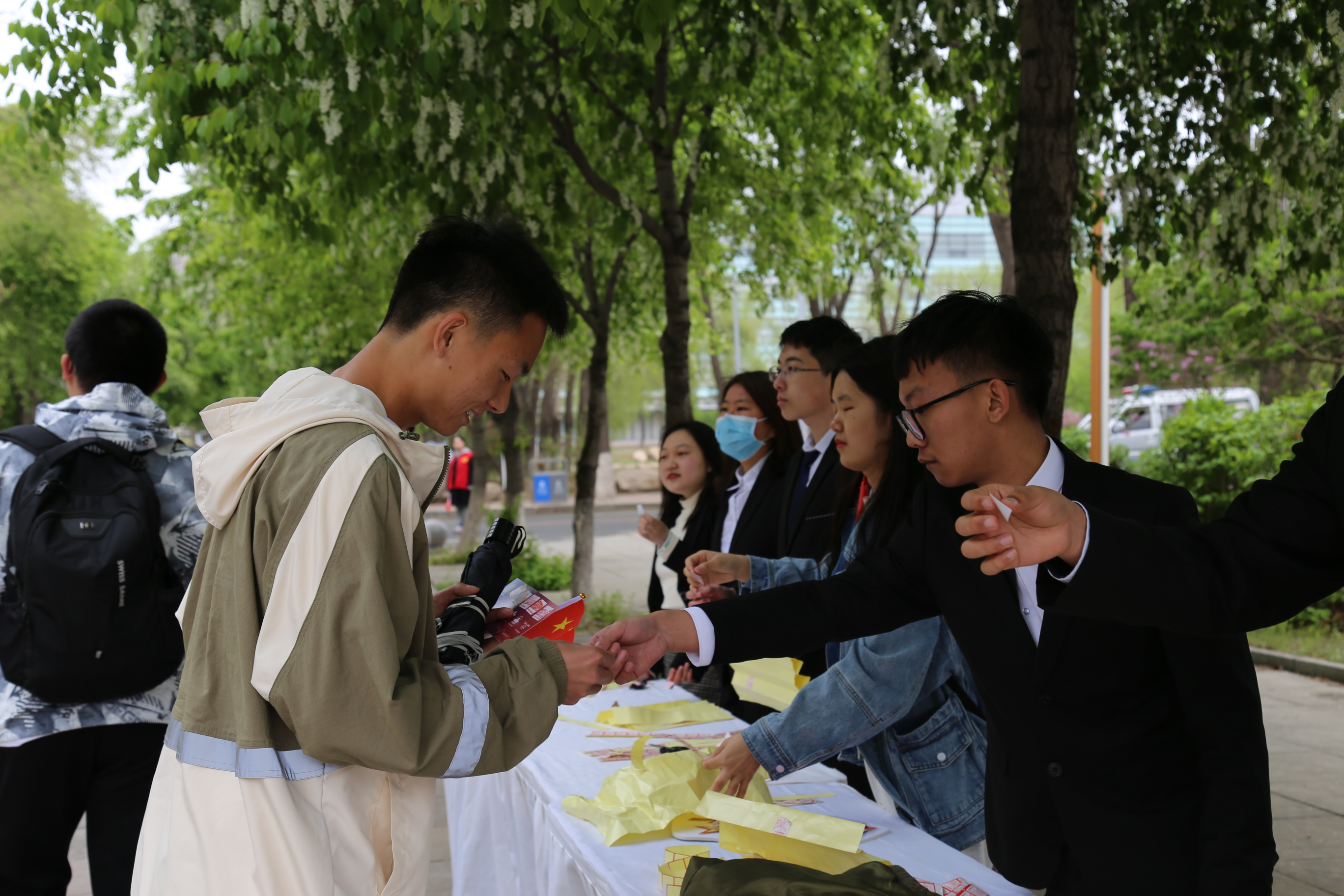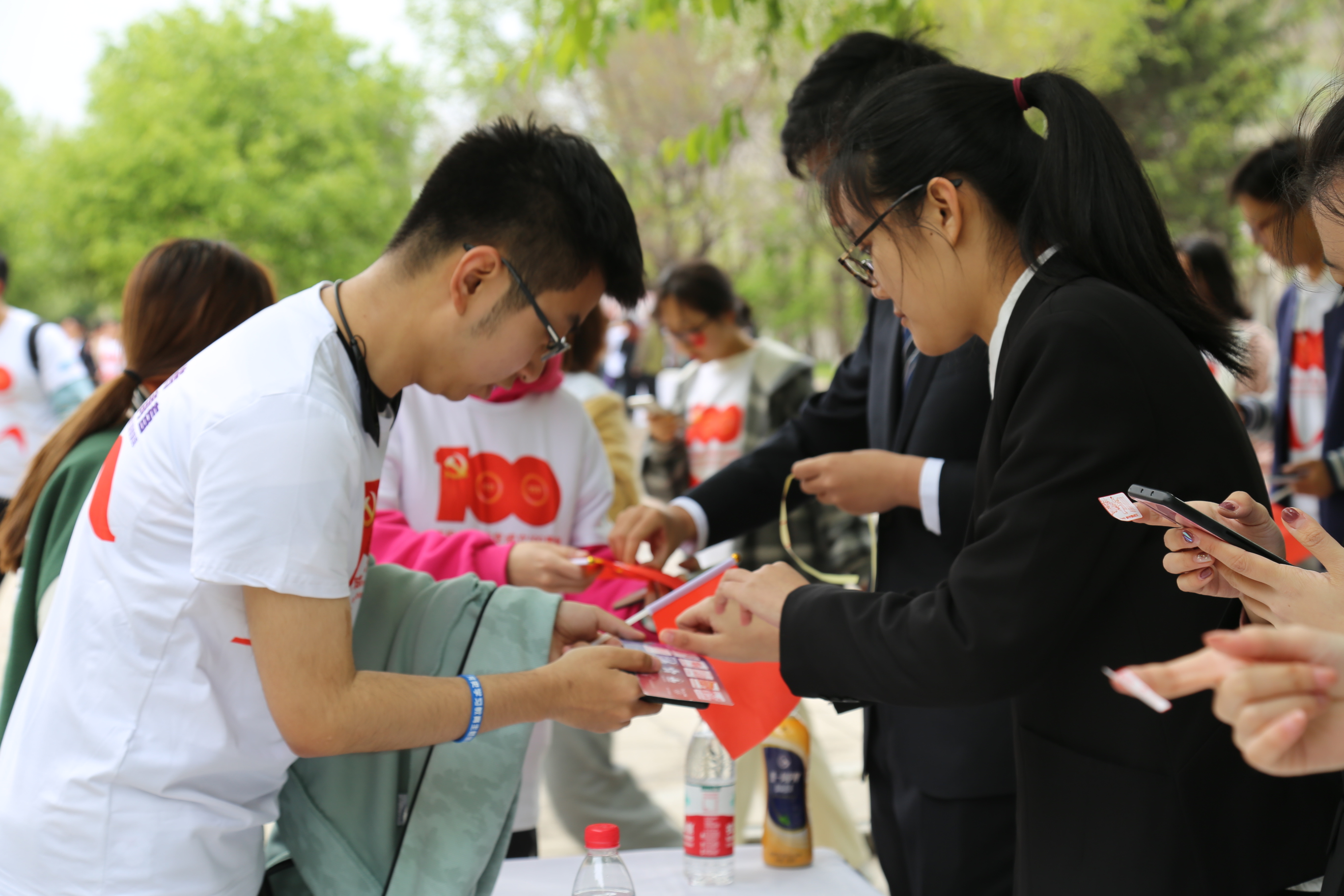 首先,到达活动现场的同学们在打卡点处进行打卡并领取了五星红旗的贴纸和旗帜,并选择参与了以下两个活动。