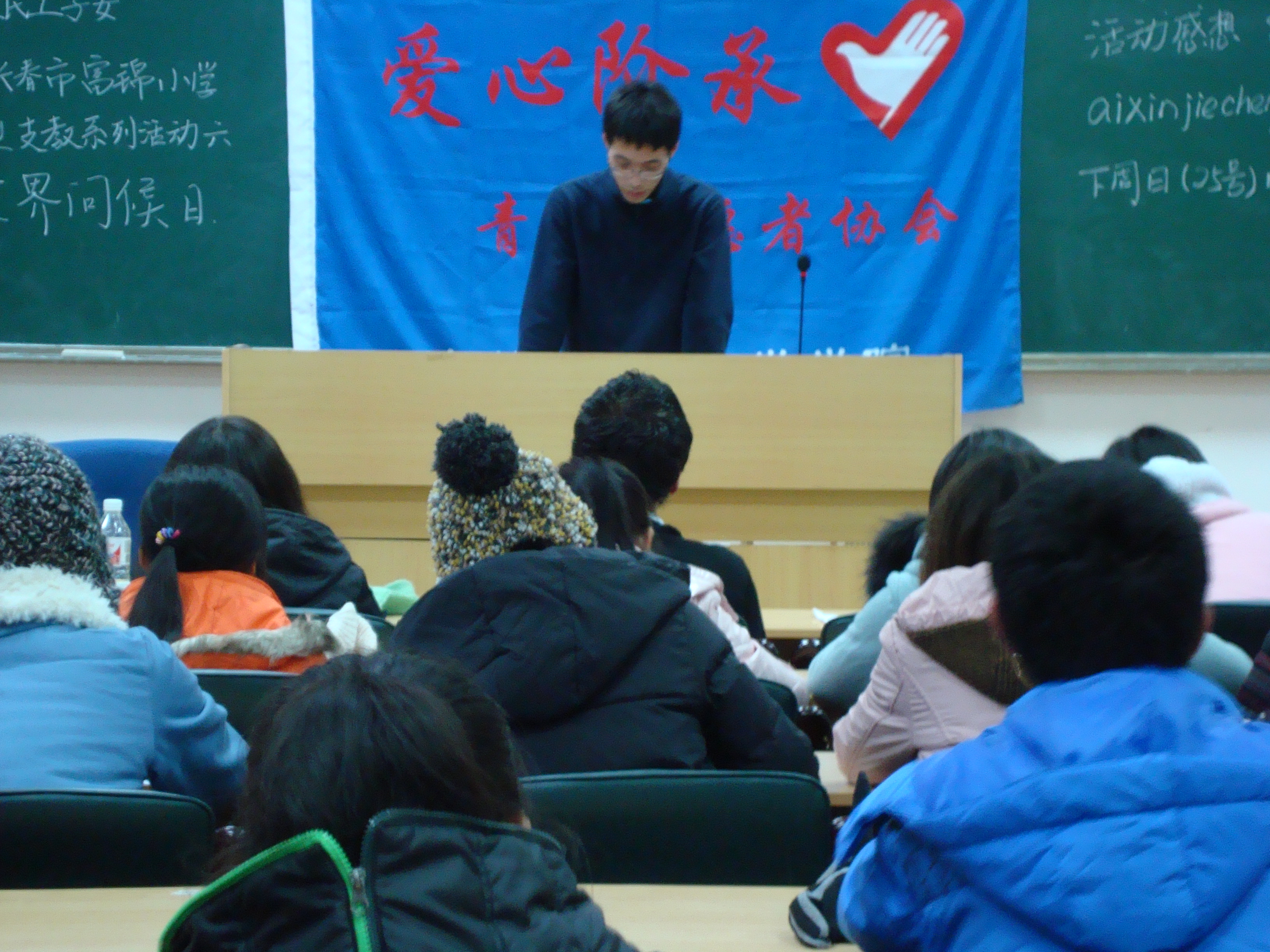 2012年11月15日晚6点,A片 爱心阶承青年志愿者协会在数学楼一楼报告厅举办了“走进长春市富锦小学--大型支教活动”系列之第六届“世界问候日”主题活动的志愿者培训。