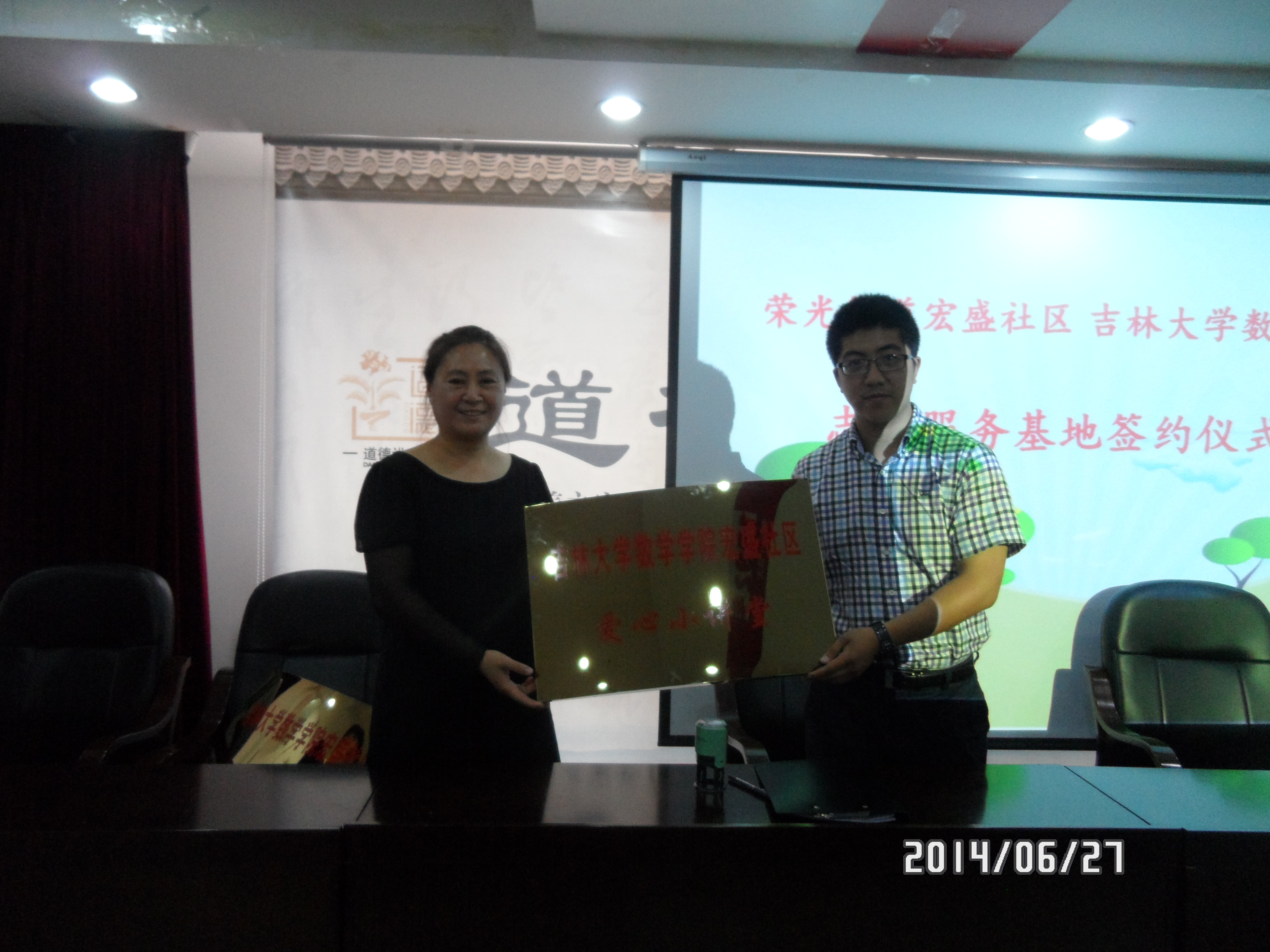 团委书记田间老师与宏盛社区李晓丰书记签订志愿服务基地与“爱心小讲堂”协议书,并为基地的落成揭牌。协议签订结束后社区代表带领A片