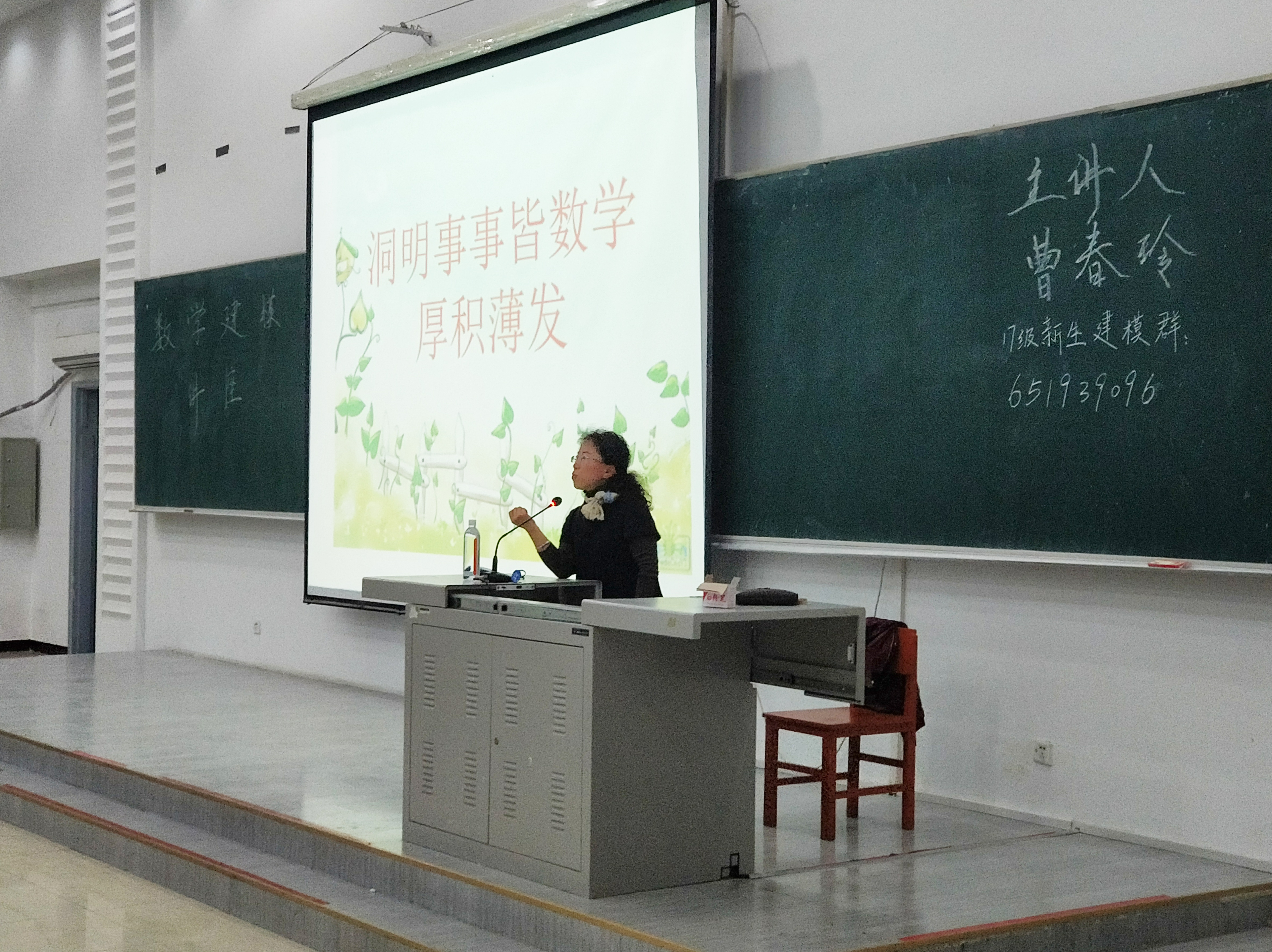 首先,曹春玲老师从“为什么要学数学”、“数学和我们的关系”、“数学模型和我们的关系”三个方面引出数学建模与生活的联系。然后,老师通过分析近几年的建模试题,向新生们深入浅出地说明了数学建模中大数据的重要性。最后,老师向同学们介绍了美国大学生数学建模大赛的情况,学生们往年参加数学建模大赛的种种经历。
