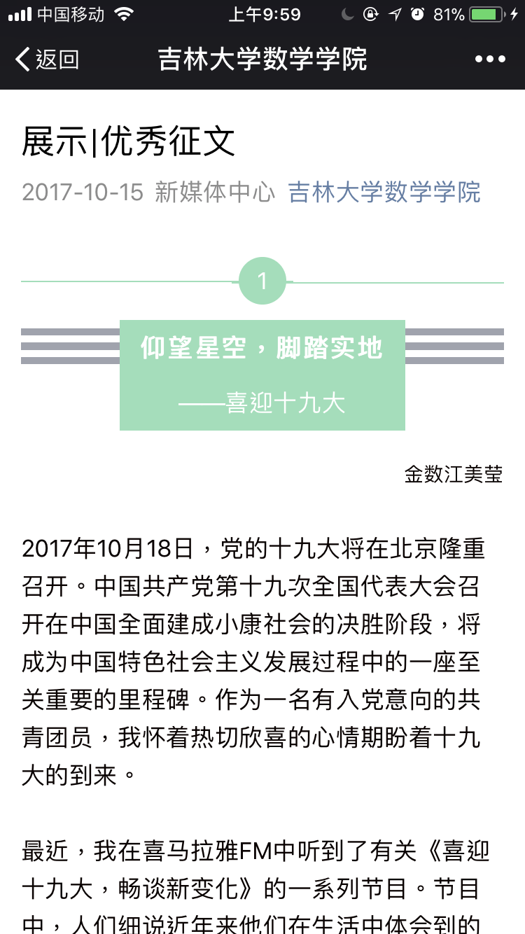 本次征文活动的成功举办,调动了同学们了解党的政治方针的积极性,使同学们更加关注党的政策,响应党的号召,预祝十九大圆满成功。