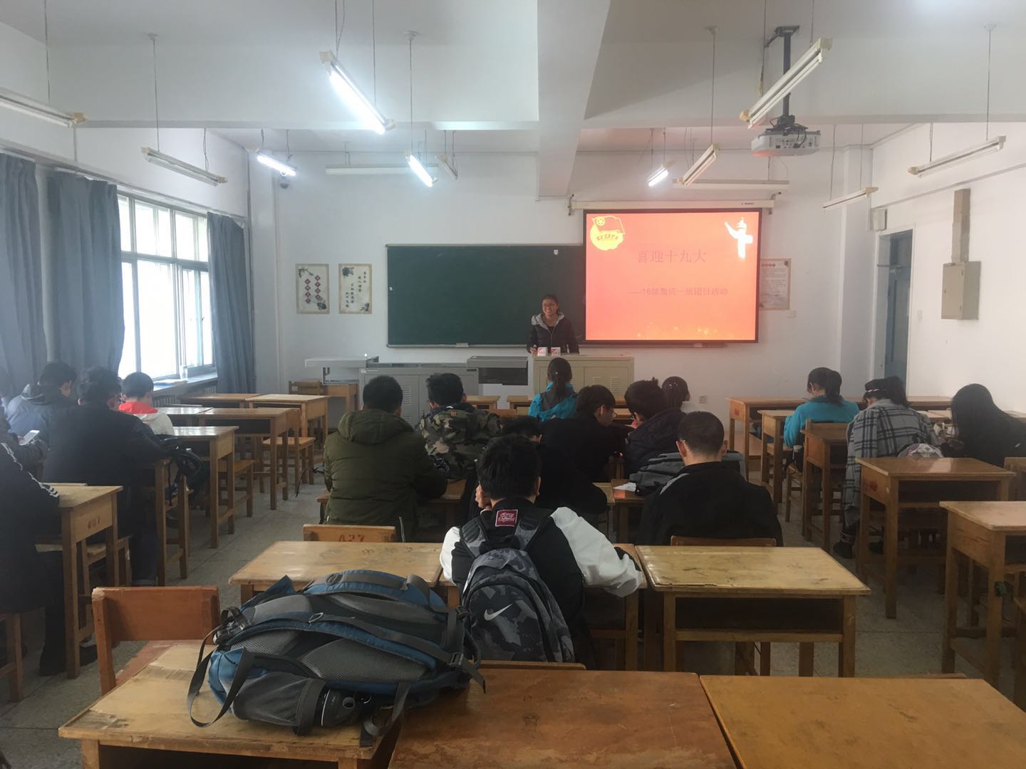 班会过程中,首先由团支书做开场演讲兼主持工作,为大家介绍十九大的背景。随后,班长组织同学观看十九大相关视频,班级同学分为若干小组讨论十九大的未来与过去,回眸过去,并展望未来,每个小组在讨论后选出一位代表上台前演讲,发表自己对于十九大的见解认识。大家认为我们这个拥有几千年悠久历史的文明古国,曾几度兴衰,从“九一八”的战火到卢沟桥事变,从南京大屠杀,到皖南千古奇冤,外强内患,村村遗骨,处处狼烟,在中华民族危亡的紧急关头,中国共产党领导千百万中国劳苦的大众,用锋血和生命赢得了中国革命的伟大胜利,天安门城楼上的庄严宣告,响彻了大江南北,震惊了整个世界,中国人民从此进入一个当家做主的新时代,祖国发生了日新月异的变化:工农业生产蒸蒸日上,人民生活普遍改善,科学技术突飞猛进,改革开放蓬勃发展。