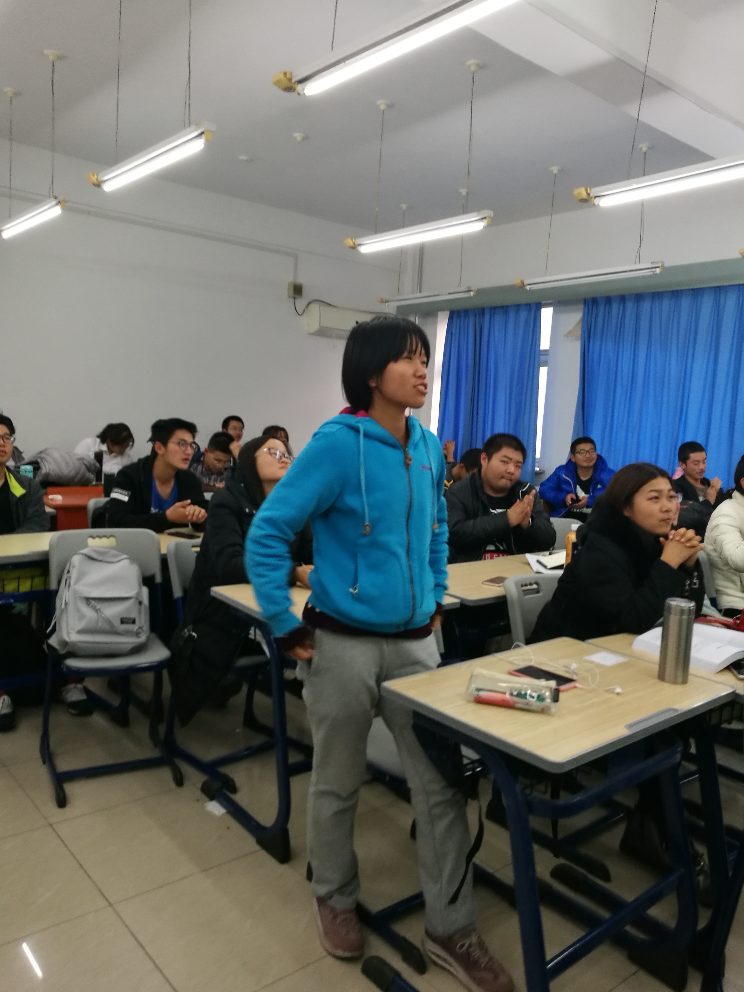 班会先后分为五个部分。首先,团支书秦雨萱向同学们历数了十八大以来中国发生的引人瞩目的成就,深刻激发学生的民族自豪感,然后就十九大工作报告的主要内容与关键热词进行简述,并引用多个外媒评价向同学们说明十九大对于中国发展的指导意义。第二部分,团支书引导同学们就几个十九大报告热点进行小组讨论与发言,同学们分别从党章修改、社会主要矛盾的变化、十件民生实事、四个重要判断等几个方面展开话题并选派代表发言,其中第三组代表路延旭同学发言说,主要矛盾转变体现了时代发展的节奏与脉搏,是我国发展新的历史方位,这也为作为当代中国人的我们提供了新的挑战与机遇。第四组代表宋佳宁同学发言表示,十九大中提出的十大民生实事透露了我国民生新举措是真正惠及人民生活,提升人民幸福感的举措,深刻体现科学发展观以人为本的核心。第三部分,同学们针对团支书提出的问题,即十九大以后“我”作为大学生应担当怎样的责任与使命,进行独立思考并写在纸上上交,团支书筛选出优秀有特色的回答并请同学上台具体论述,其中宁昕同学认为,中国梦是历史的、现实的,也是未来的;是我们这一代的,更是青年一代的。这让她感受到国家发展、民族振兴的强烈脉动,而她也必将努力融入到这份激情中去。第四部分,同学们共同观看电影《智取威虎山》,感受中国共产党人在领导人民解放过程中的不懈抗争与伟大牺牲,激发同学们对党和国家的坚定信念与不灭热情。