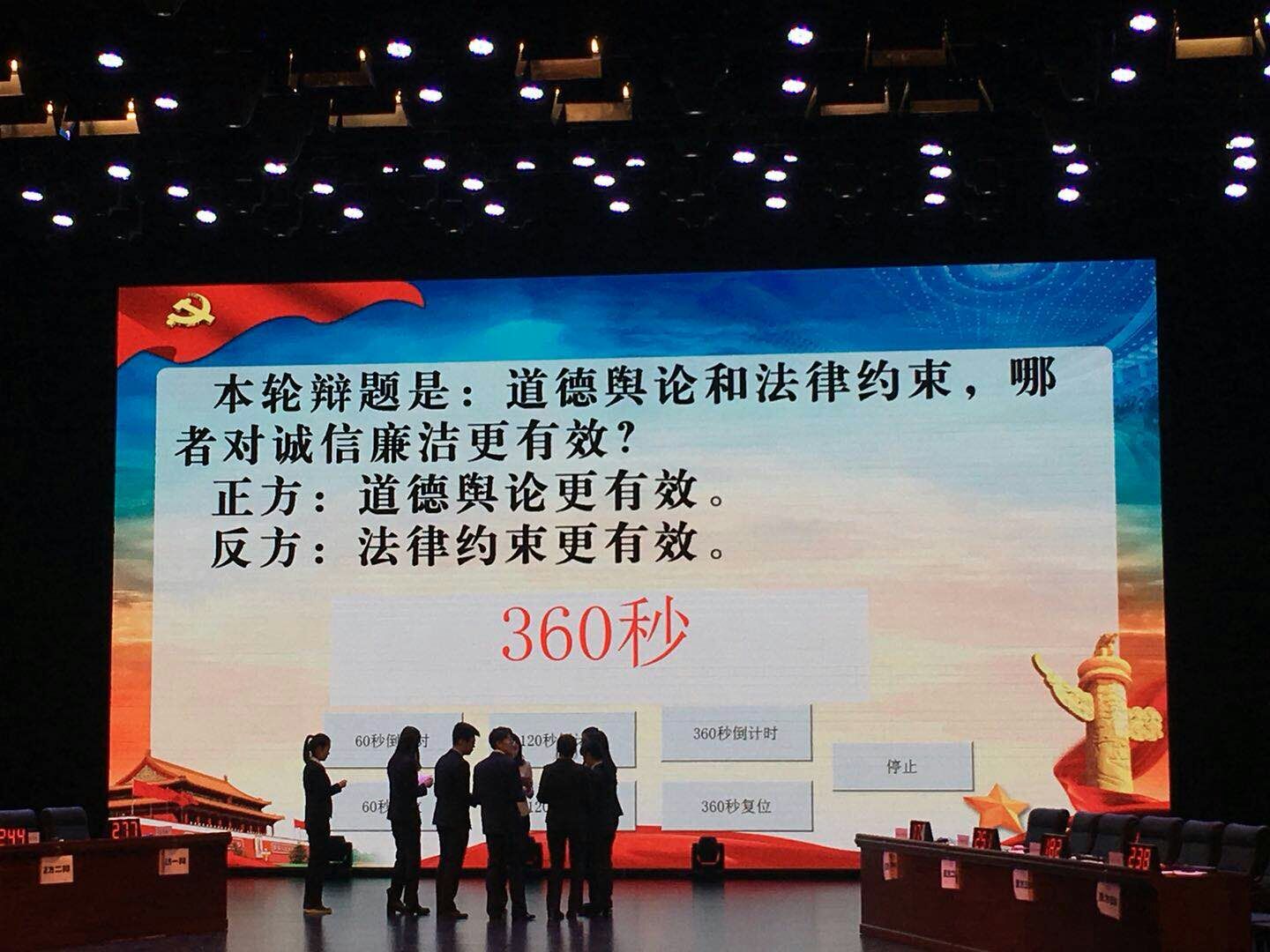 主持人阐述此次活动目的和意义后,比赛正式开始。第一轮为知识抢答环节,由30道选择题与20道判断题组成,题目以廉洁为主题、涉及中共现行廉政政策、国内外各项廉政法律条文等。比赛战况激烈,各支队伍抢答积极、表现活跃,比分交替增长。第二轮为即兴问答环节李玉涵就“作为一名学生党员,如何提高党性修养,加强学习型、服务型、创新型支部建设”进行了180秒的即兴回答,第三轮为主题辩论环节,题目为“道德舆论和法律约束,哪者对诚信廉洁更有效”。苗凯伦同学抽取反方一辩,陈述了在当前社会环境下法律约束要比道德舆论更具有时效性,更加的简洁高效。第四环节为主题猜词。40秒答题时间内,系统随机给出与廉政有关的成语、机构、罪名、影视作品,李玉涵同学描述,刘月同学猜词,两人配合默契,接连答对3题。第四轮为主题附加展示环节。秦雨萱、宋佳宁、李泉瀚同学进行了软笔书法及诗朗诵表演。五轮比赛结束后,A片