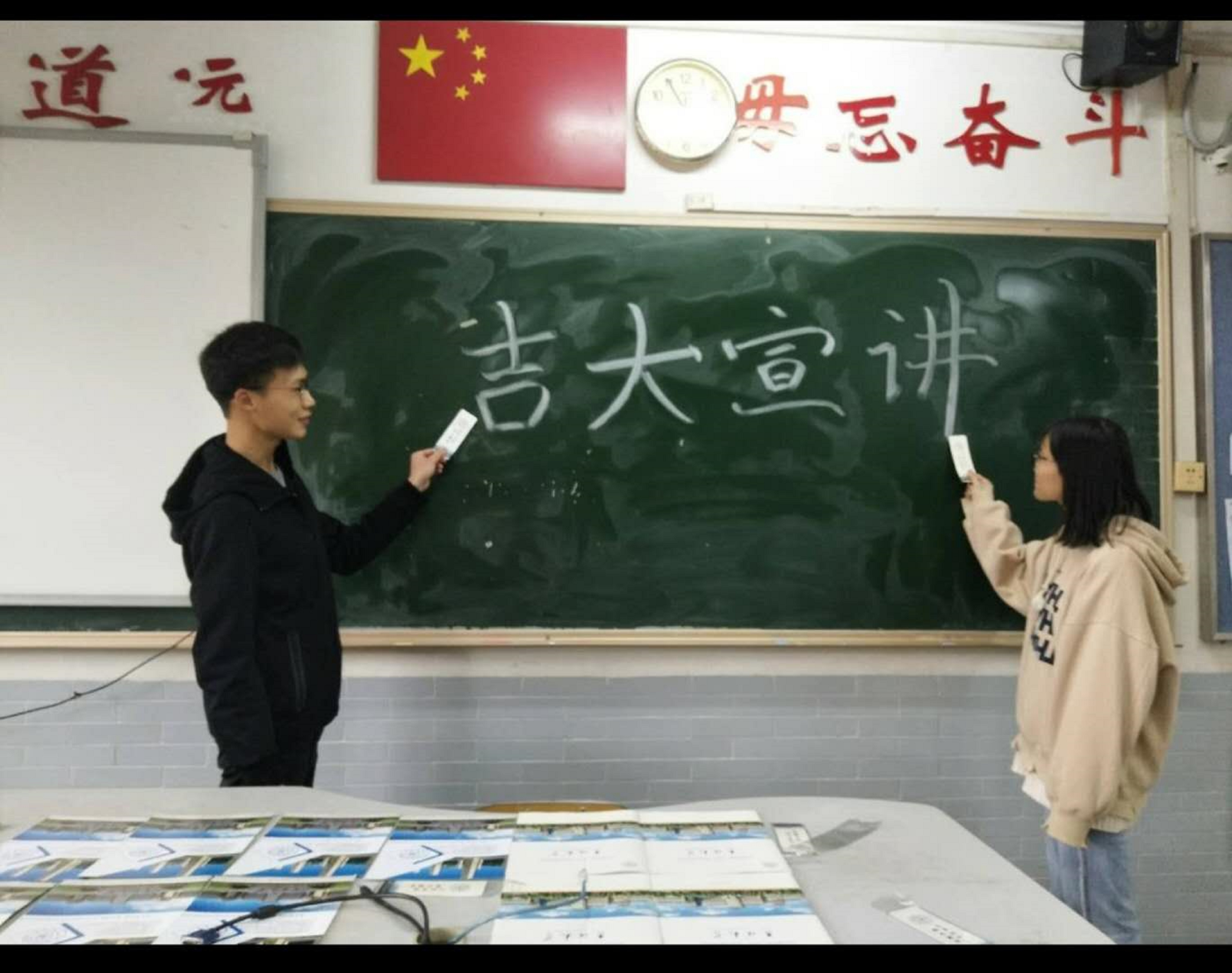 101705团支部在寒假期间派出六支宣讲队伍分别前往山东烟台经济技术开发区中学、成都郫都一中、山东省潍坊市临朐一中、石门中学、山西省郓城市康杰中学和河南三门峡市外国语高级中学参与宣讲。宣讲同学给所在高中的同学们发放吉大宣传册,在准备宣讲过程中家长和学生都十分认真的翻阅。以临朐中学为例,带领宣讲的同学带队在报告厅向母校高三学生宣讲吉大A片