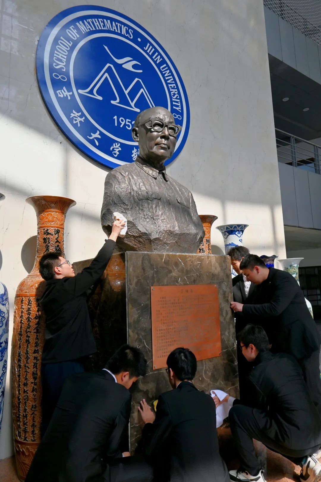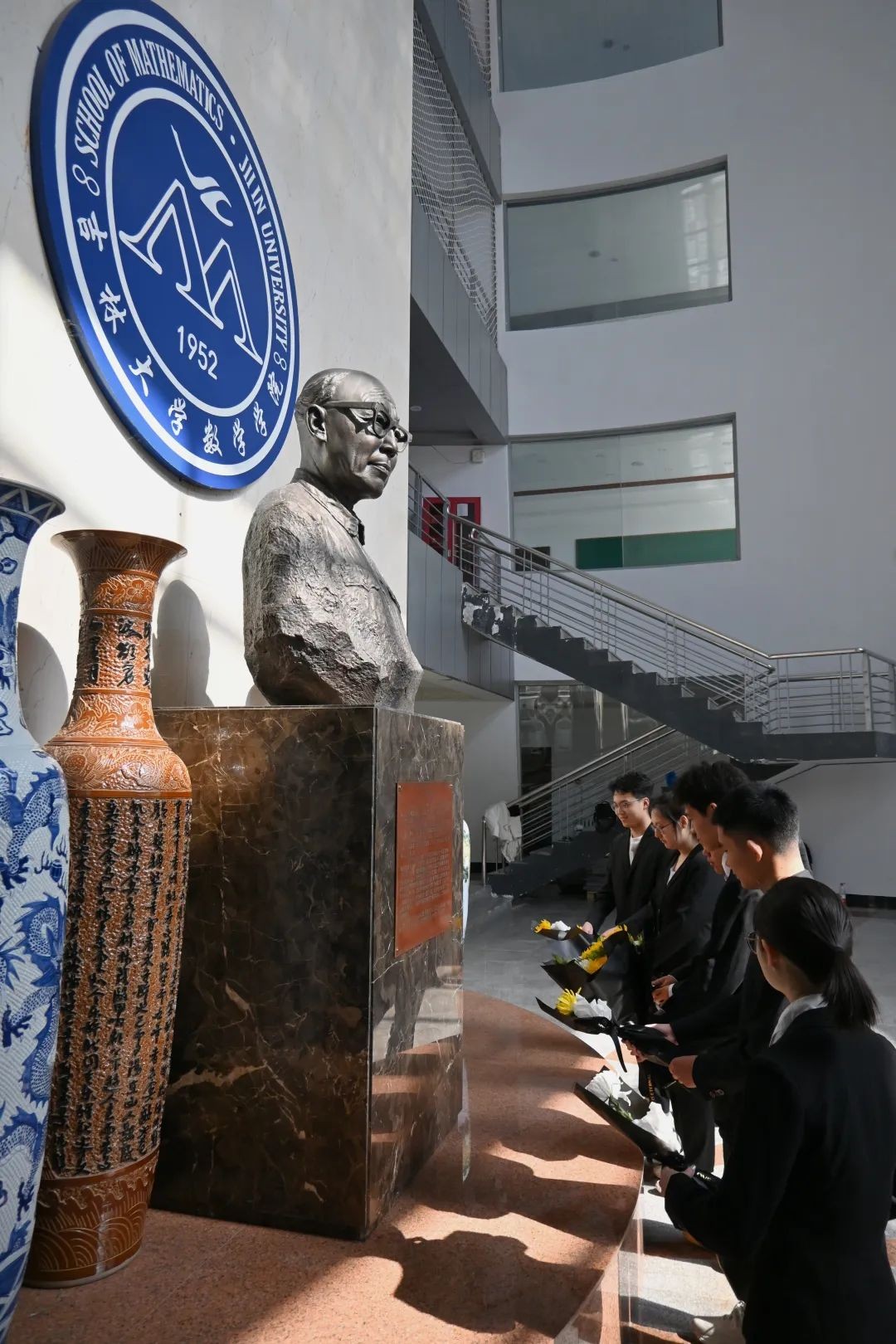 学生干部代表在数学楼一楼王湘浩先生雕像前举行了缅怀纪念仪式。学生们着装整齐、神情肃穆,共同表达对王湘浩先生的敬仰与怀念之情。