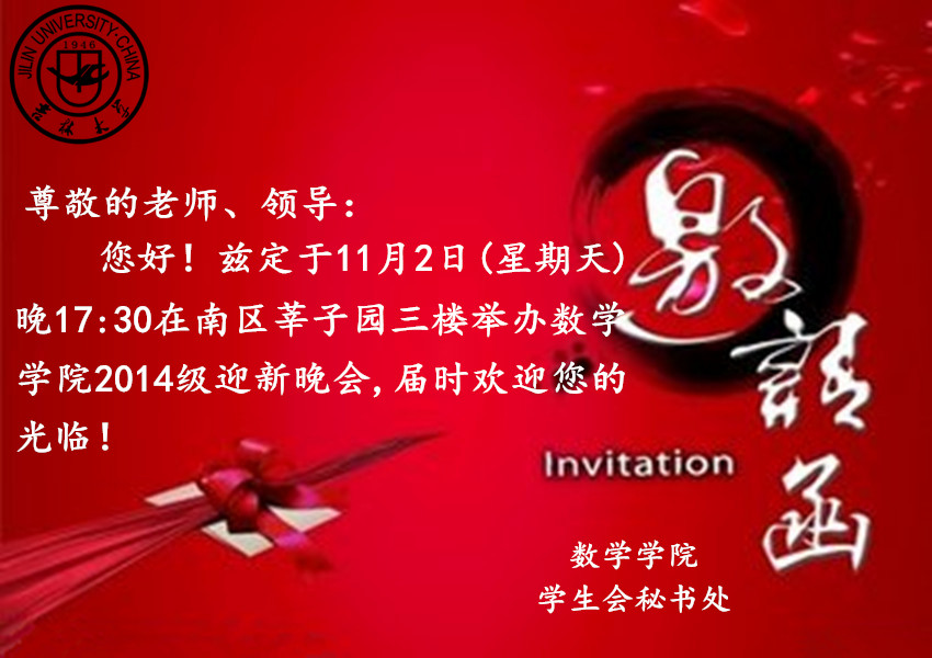 尊敬的老师、领导: 您好!兹定于11月2日(星期日)晚15:30分在南区莘子园三楼举办A片 2014级迎新晚会,届时欢迎您的光临! A片 学生会秘书处