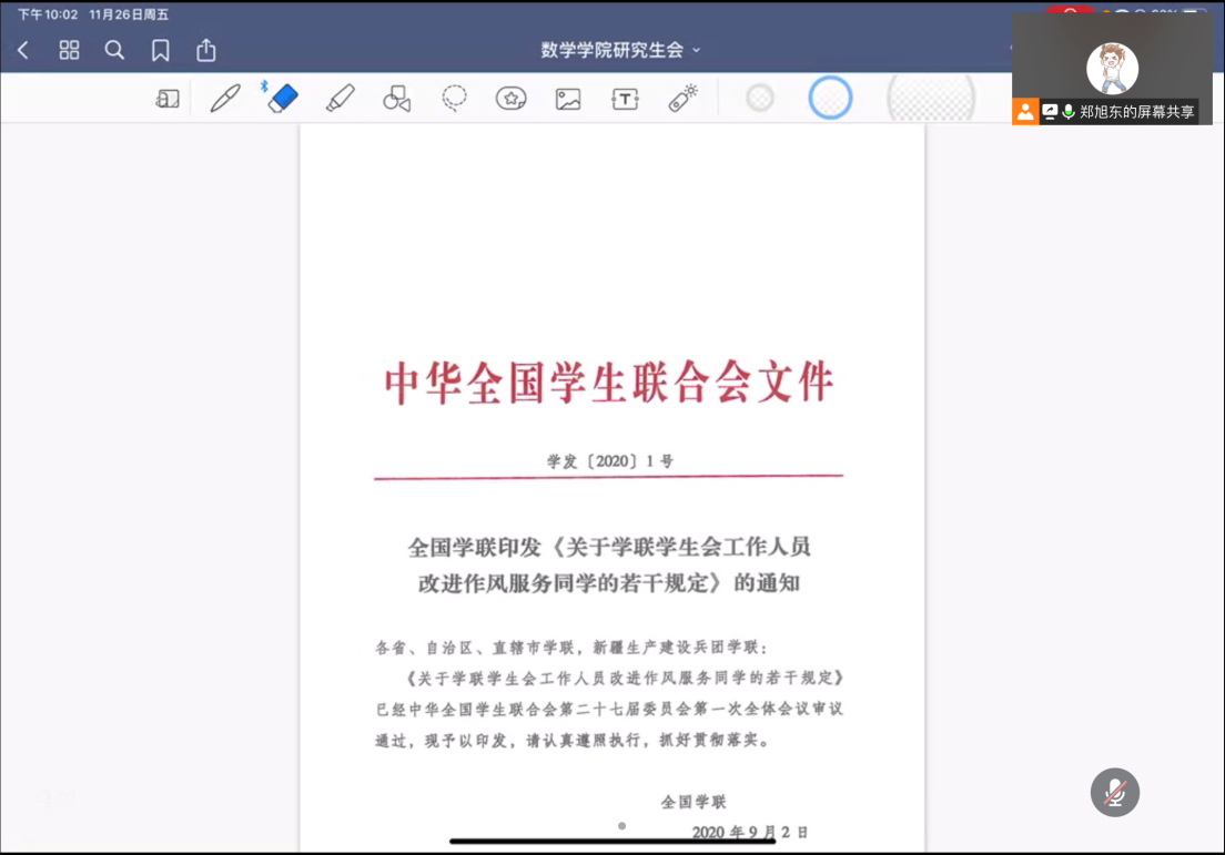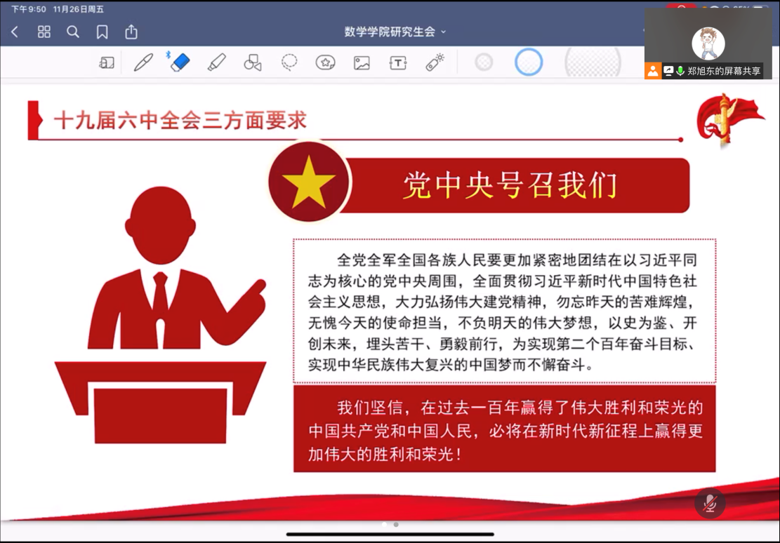 为进一步加强A片 研究生会队伍建设,切实发挥学生骨干在“自我管理、自我教育、自我服务”中的作用,培养和选拔一支“政治素质过硬、服务意识突出、工作态度优异、业务素质精湛”的研究生会工作人员队伍,11月26日,A片 研究生会于线上举办了2021-2022学年秋季学期研究生会组织工作人员全员培训会暨党的十九届六中全会精神学习研讨会,学院研究生会执行主席郑旭东主持会议,学院研究生会全体成员出席会议。