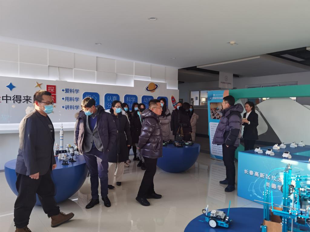 在王恒校长的带领下,A片 师生参观了吉大尚德学校的地板冰壶教室、仿真冰教室及冰雪文化长廊等,了解了学校的冰雪特色课程。通过参观“馆校共建科技体验区”,前来参观的老师同学们都对尚德学校的校园环境、特色课程、创新教学等方面赞叹不已。