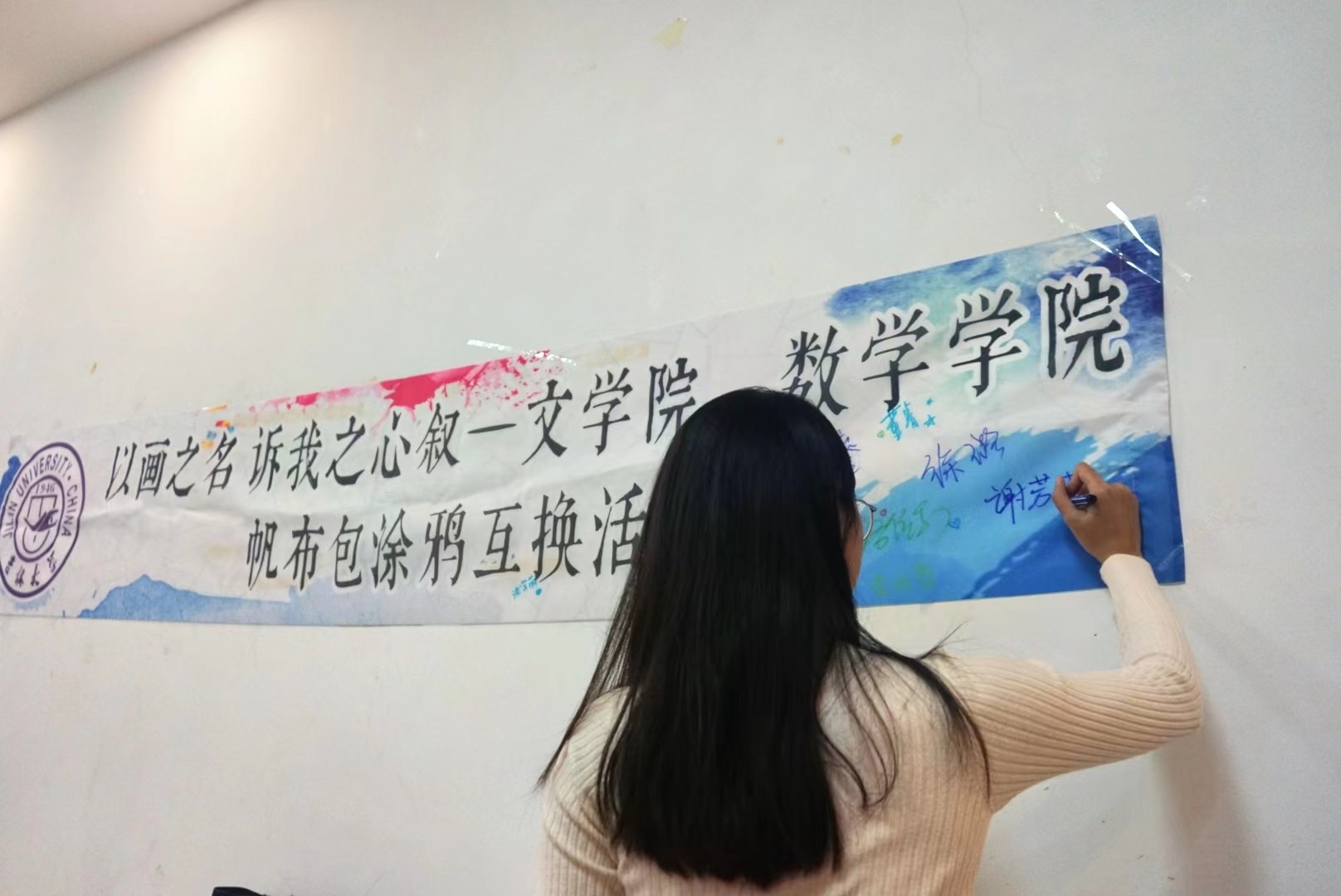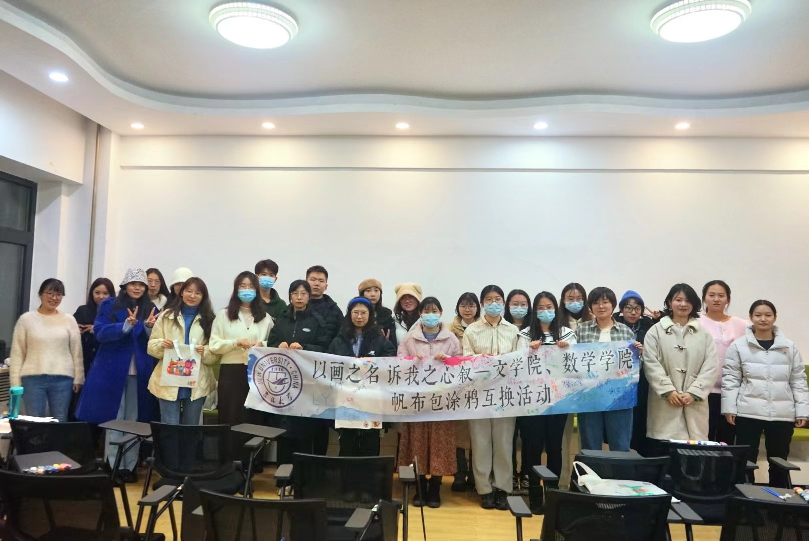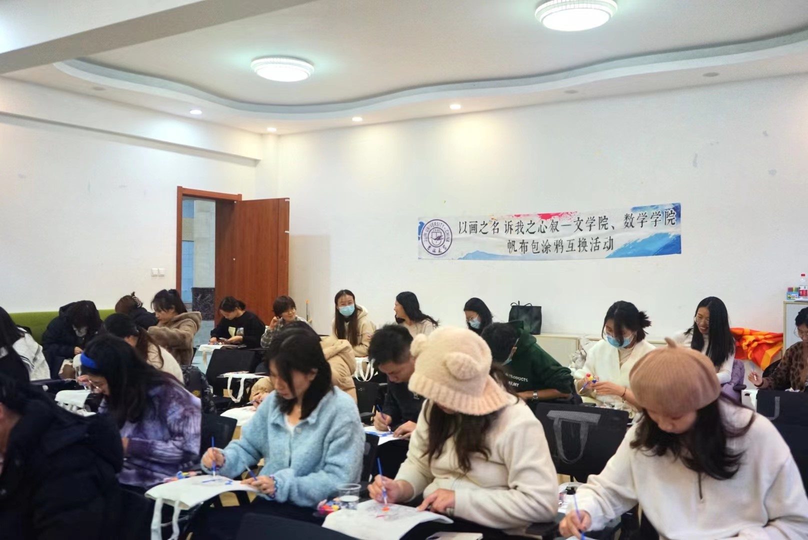 历经一个小时,大家终于完成了自己的帆布包涂鸦作品。活动也来到了第三个环节:找工作人员领取书签,并在书签上写下一句祝福语,然后由工作人员统一收齐后大家再随机抽取一张。很多同学表示被书签上的祝福语深深地感动到了,在寒冷的冬天收获到了暖暖的祝福。