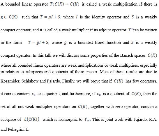 报告人简介:At this moment he is a postdoc student at Federal University of São Paulo, where he is studying Lipschitz free Banach spaces and their applications. Also, he has continued working on Banach spaces C(K) with few operators which was the topic of his doctoral dissertation. As a result, a manuscript on the subspaces of linear operators on C(K) contained in the set of not weak multiplier operators is being completed in collaboration with R. Fajardo and L. Pellegrini. Before he joints UNIFESP, he pursued his PhD in mathematics. In his PhD thesis they found some topological conditions on a compact K, related to the property of C(K) having few operators. They also proved that there exists an indecomposable C(K) that has some not weak multiplier operators. Moreover, assuming the Diamond Principle, they constructed a compact non-weakly Koszmider Space K, which has no trivial retractions. In the next couple of months he will move to Rio de Janeiro where he will be a Professor at Rio de Janeiro State University.