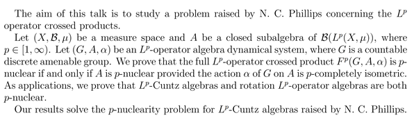 报告题目:p-nuclearity of L^p-operator crossed products