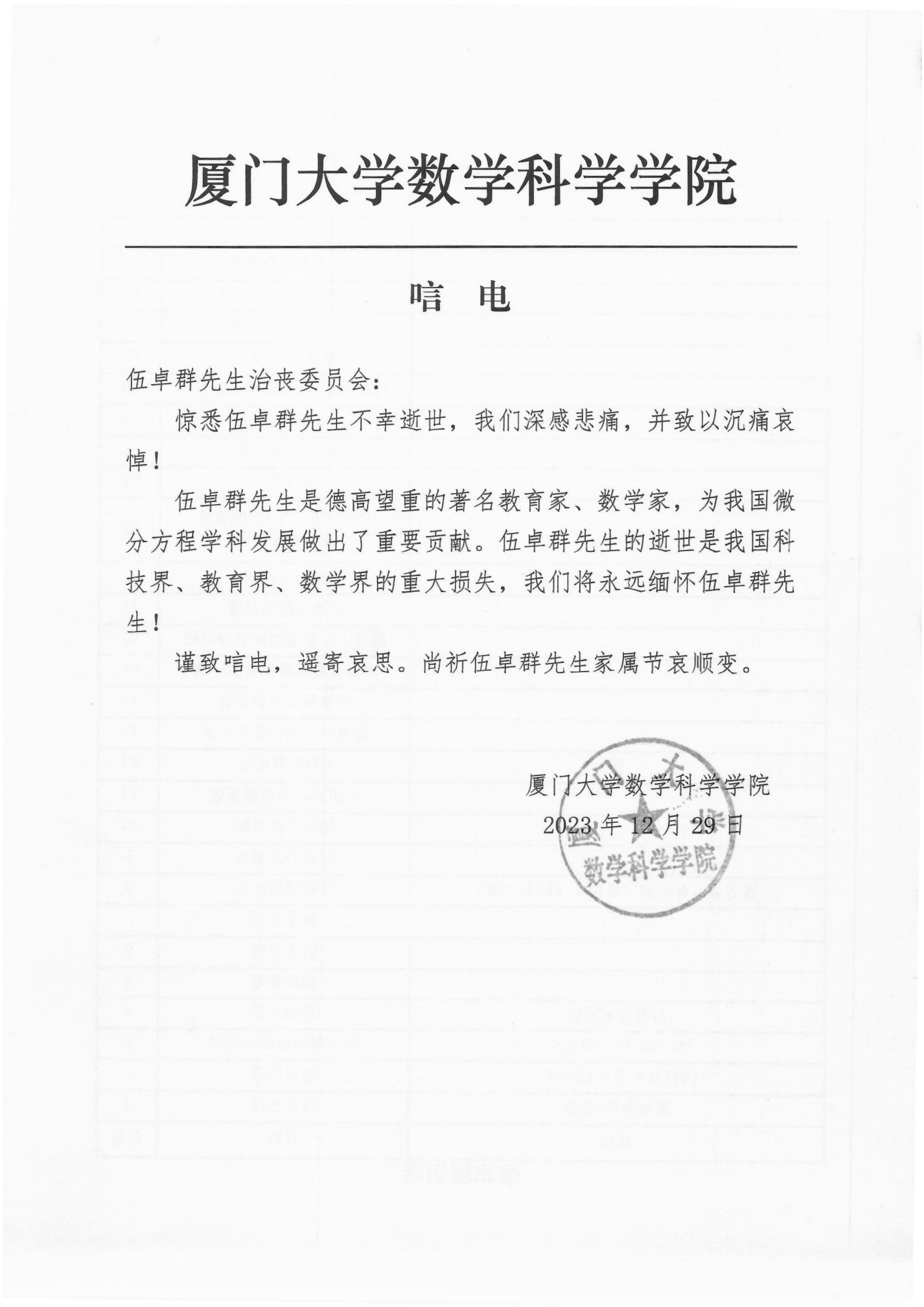 厦门大学数学科学学院唁电