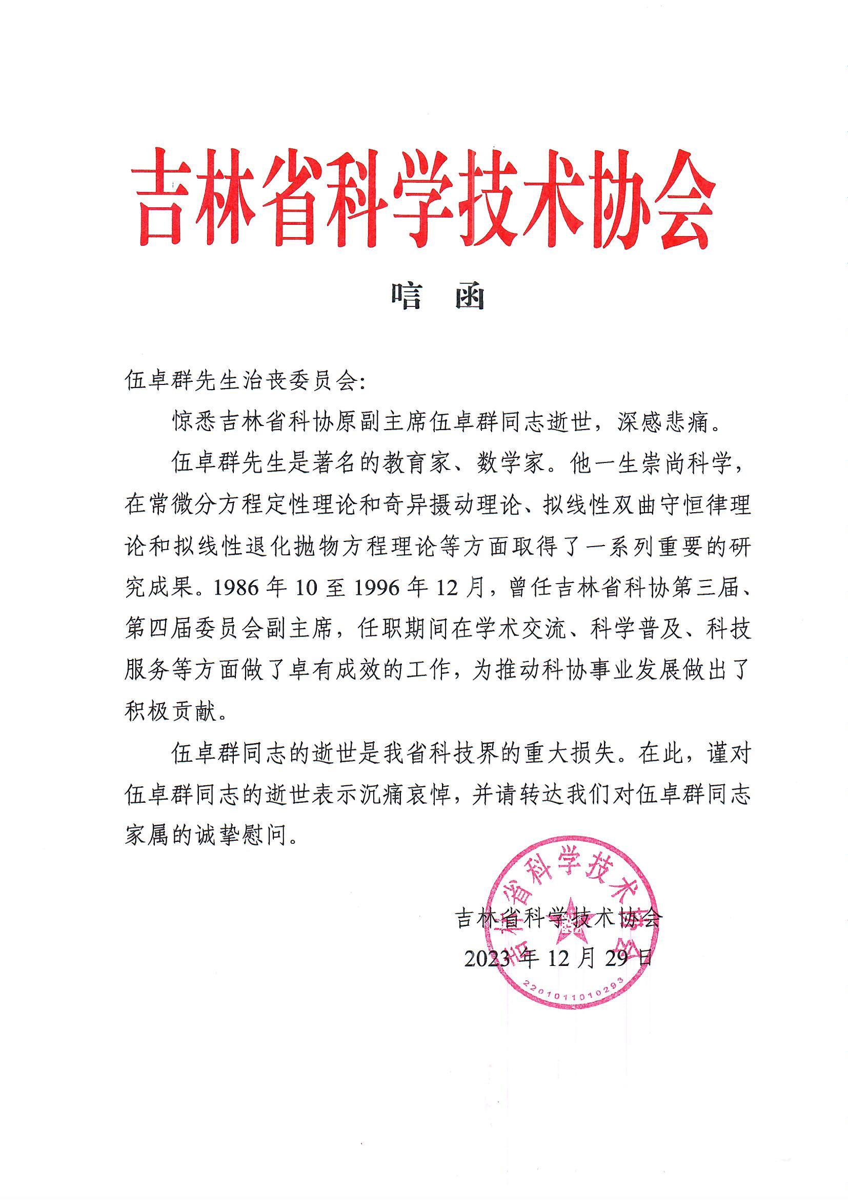 吉林省科学技术协会唁电
