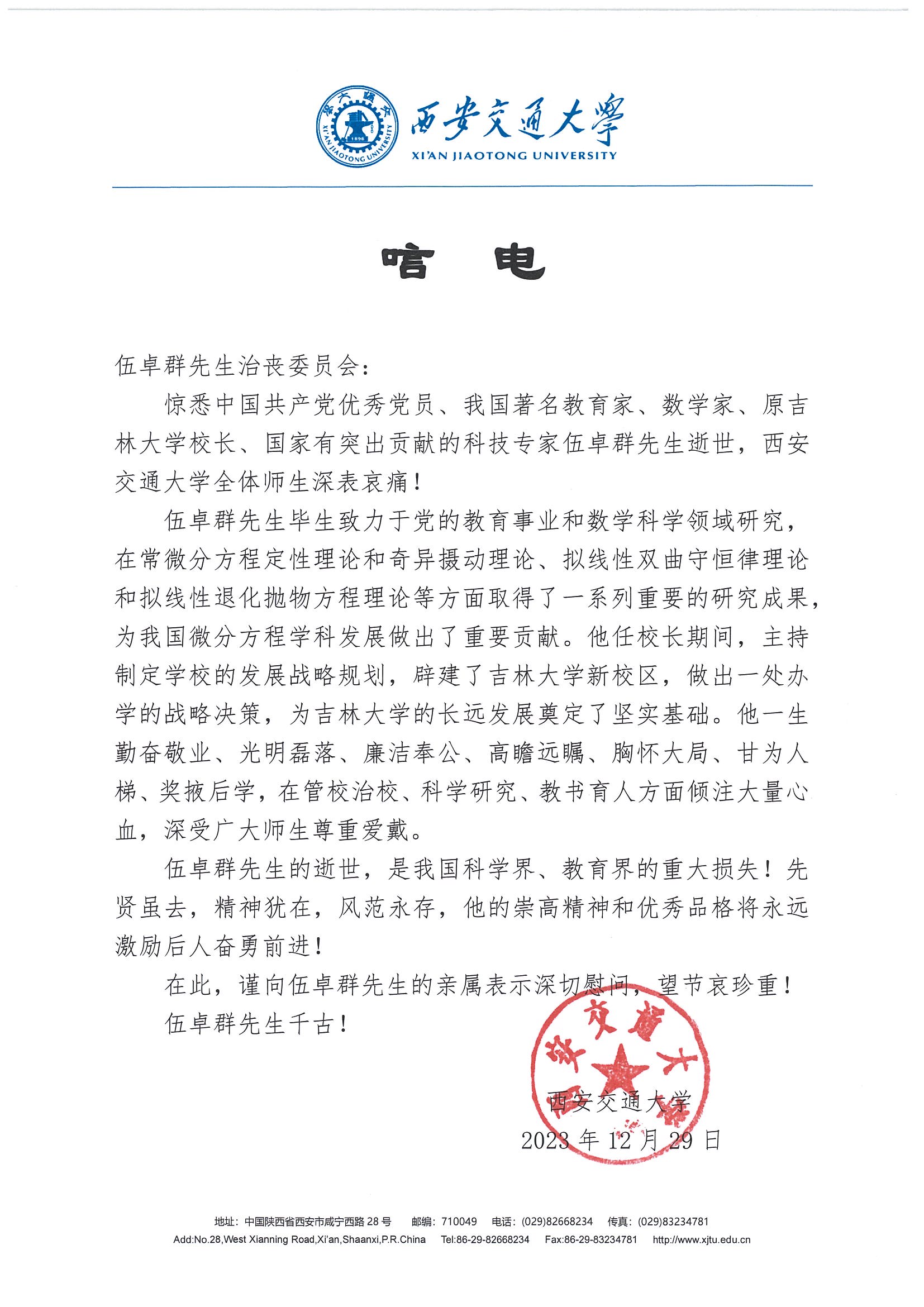 西安交通大学唁电