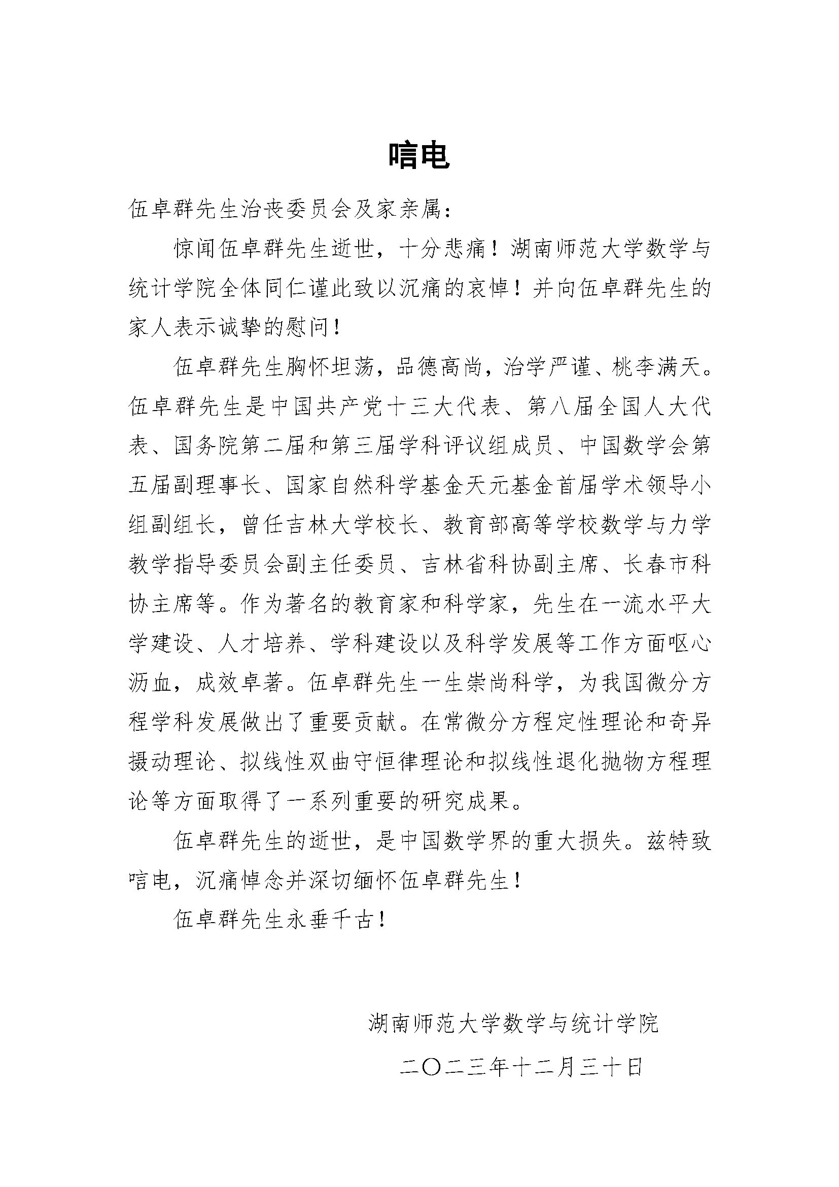 湖南师范大学数学与统计学院唁电